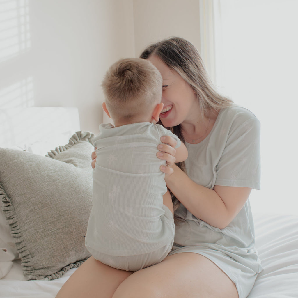 Lush Palms is a milky green paired with hand-drawn palm trees on the softest ribbed bamboo.